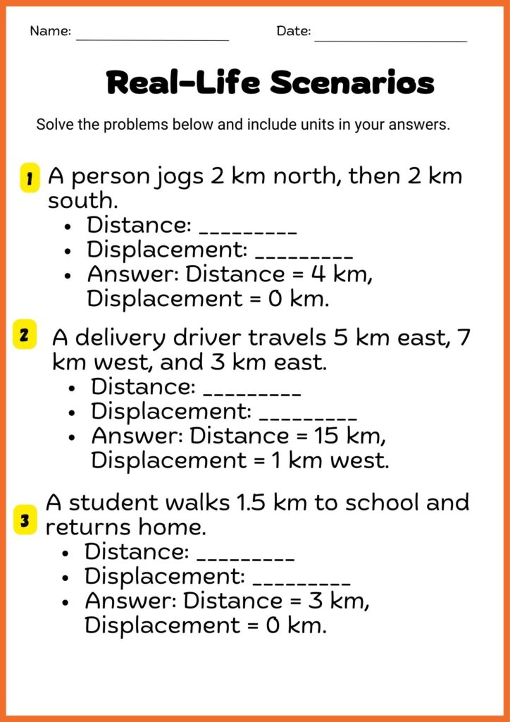 This Distance and Displacement Worksheet is designed to help students understand the difference between distance and displacement in a simple and clear way. It includes step-by-step explanations and practice exercises that make learning easy. This worksheet is useful for students of different grades, including grade 7, grade 8, grade 9, and grade 12. It helps in building a strong foundation in physics by explaining how to measure and calculate distance and displacement correctly.