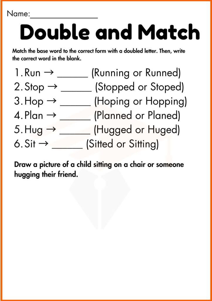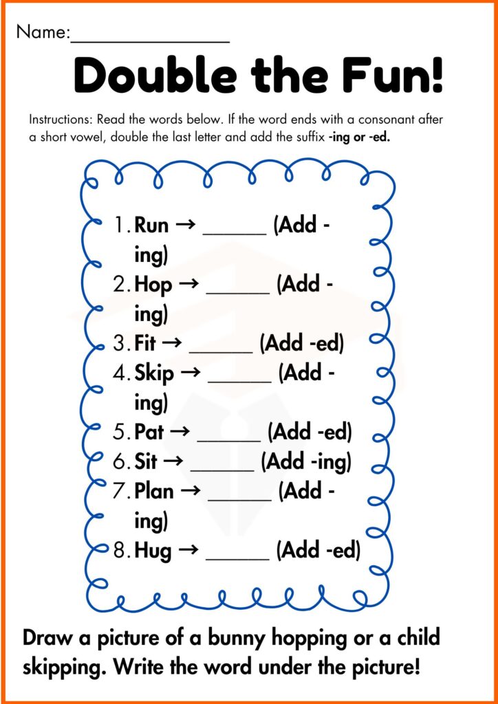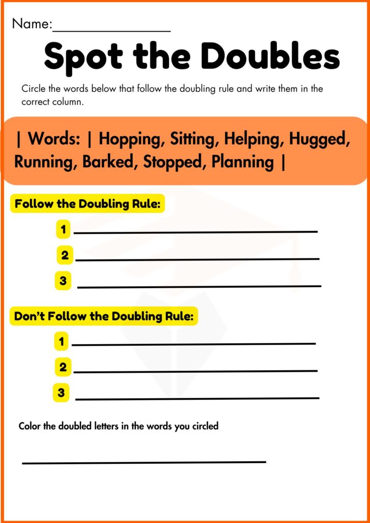 This Doubling Rule Worksheets is a practice sheet for students who want to learn and master the doubling rule in spelling. The doubling rule helps you know when to double the last letter of a word before adding a suffix (like -ing, -ed, -er). For example, “run” becomes “running,” but “jump” becomes “jumped” (no doubling). This rule can be tricky, but this worksheet makes it easy to understand!