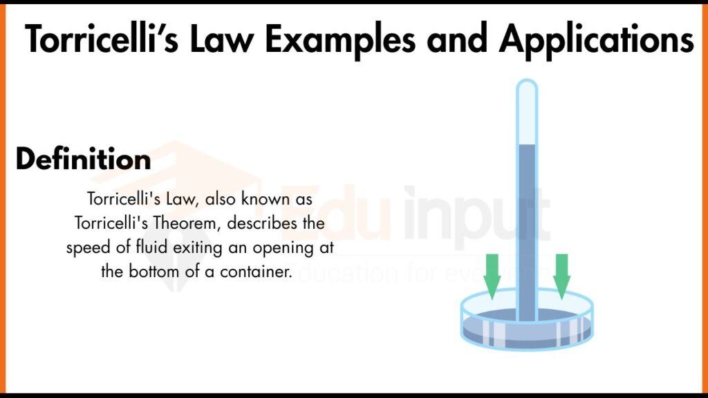 Torricelli’s Law is a fundamental principle in fluid dynamics that describes how fast a fluid exits a small hole in a container. According to this law, the velocity v of the fluid leaving the hole depends on the height h of the fluid column above the hole and is given by the equation: